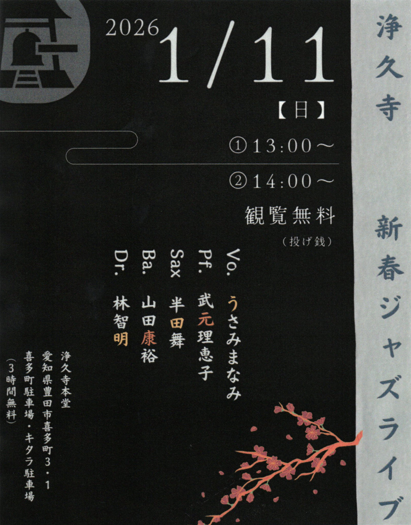↑↑↑↑LINE(ライン)のお友達追加はこちらから! 浄久寺さん新春ジャズライブのお知らせ 2025年12月25日 最終更新日時 : 2025年12月28日 info ハッピーカルチャーみんとの目の前にある浄久寺というお寺さんで、 2026年1月に新春ジャズライブが開催されます! 新春ジャズライブ 2026年1月11日(日) ①13:00〜 ②14:00〜 観覧無料(投げ銭) 出演者 Vo. うさみまなみ Pf. 武元理恵子 Sax 半田舞 Ba. 山田康裕 Dr. 林智明 会場 浄久寺 愛知県豊田市喜多町3-1 喜多町駐車場 キタラ駐車場 3時間無料