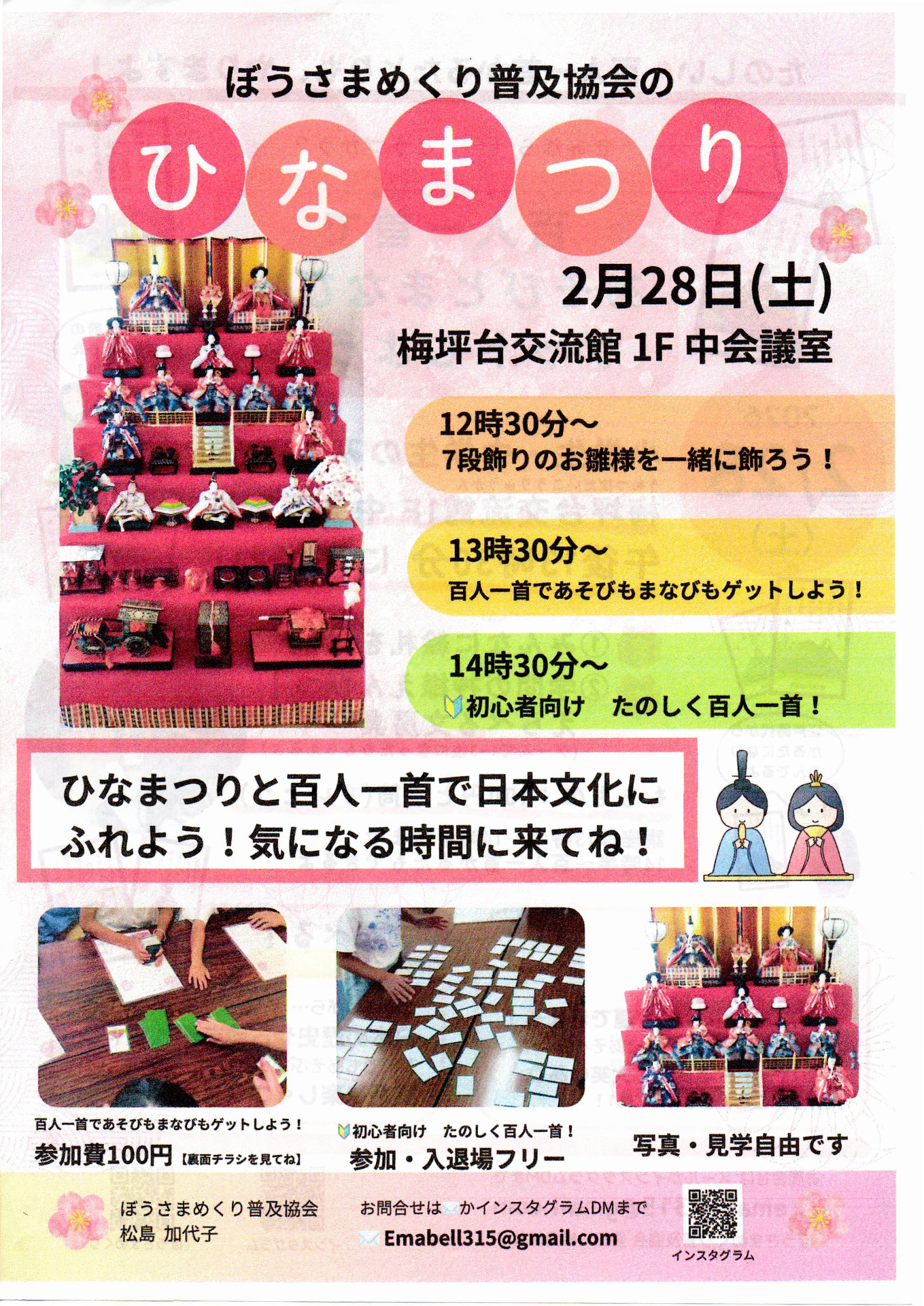 ひなまつりの七段飾りを実際に飾る体験や、百人一首かるた遊びを通して、日本の伝統文化に親しめる小中学生のみなさんも楽しめるイベント。